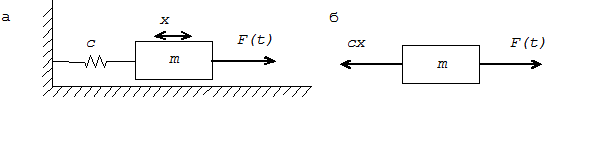Рассмотрим простейшую систему с одной степенью свободы, которая совершает колебания под действием вынуждающей силы F(t). В любой момент времени на груз массой m действуют две силы: сила упругости пружины, пропорциональная смещению груза X, и возмущающая сила F(t), изменяющаяся во времени по некоторому, заранее заданному закону.