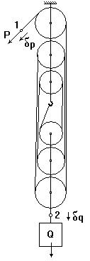 С точки зрения аналитической статики полиспаст представляет собой механическую систему, состоящую из двух точек 1 и 2, к которым приложены силы P и Q, все прочее относится к реализации связи между этими двумя точками.