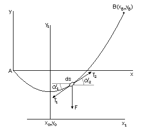 Пример 2. Рассмотрим гибкую однородную тонкую тяжелую нить, закрепленную в точках A и B, длина нити – l