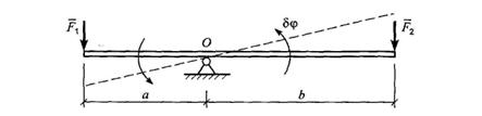 Принцип возможных перемещений был известен со времен Архимеда под названием «золотого правила механики» и применялся к простейшим механизмам. Рассмотрим в качестве примера рычаг Архимеда Рычаг имеет одну степень свободы - может вращаться вокруг точки О. Равновесие имеет место, когда элементарная работа при повороте рычага на элементарный угол δφ равна нулю.