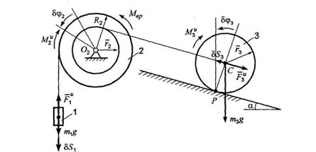 Пример I. Механическая система состоит из составного диска 2 (m2g = 20 Н, R2 = 0,4 м, r2 =0,2 м, радиус инерции относительно оси вращения i и = 0,4м), с намотанными на него нитями, на концах которых прикреплены груз 1 (т1g = 10 Н) и однородный цилиндр 3 (т3 g = 80 Н). Цилиндр катится без скольжения по шероховатой наклонной поверхности с углом наклона α=30°.