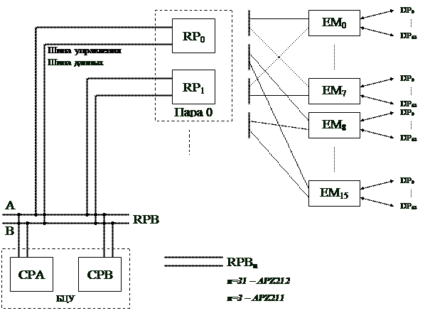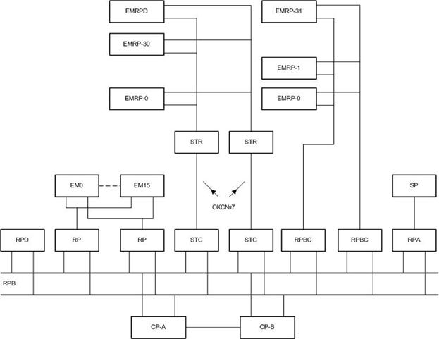 RP подключаются к СР через дублированную шину RPB (рисунок 1.15). Каждая шина в APZ 211 может обслуживать до 128 RP, в APZ 212 – до 32 RP. Общее количество RP в составе APZ211 до 512, в APZ212 – до 1024.