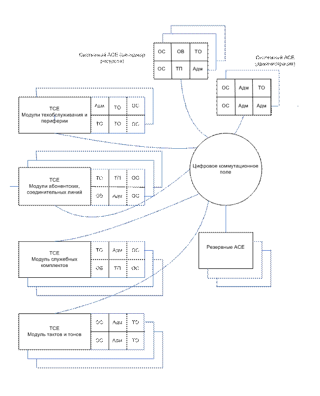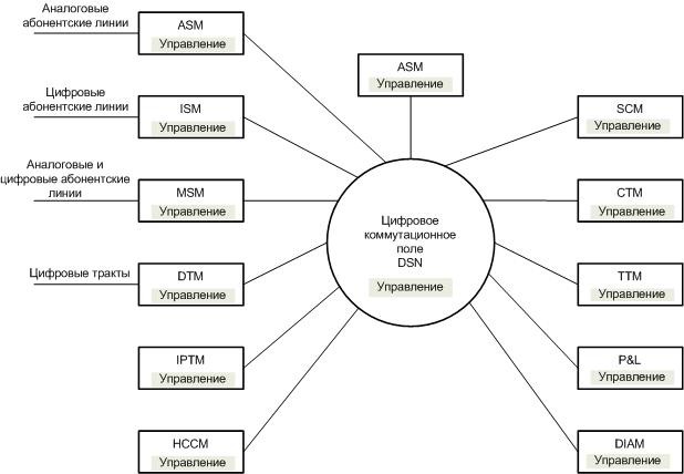 Основой станции является цифровое коммутационное поле DSN, в которое включаются различные терминальные модули. DSN обеспечивает концепцию распределенного управления, т.к. используется не только для передачи пользовательских данных, но и для организации межпроцессорной связи терминальных элементов управления.