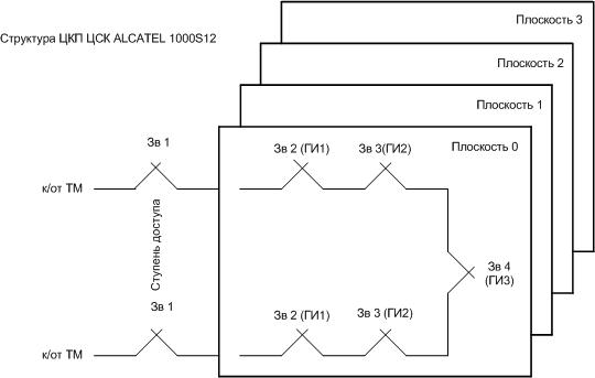 3.3.1 Цифровое коммутационное поле ЦКП (DSN) состоит из нескольких ступеней искания (звеньев) и плоскостей (рисунок 3.5). Максимальный вариант комплектации ЦКП предусматривает наличие четырех временно-пространственных ступеней (звеньев) и четырех плоскостей. Коммутационные устройства первого звена образуют ступень доступа (СД), которая находится за пределами плоскостей основного коммутационного поля. Выбор комплектации основного поля зависит от емкости станции и нагрузки: величина нагрузки влияет на число плоскостей, а емкость – на число ступеней ГИ.