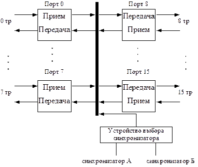 3.3.2 ЦКП построено на цифровых коммутационных соединителях ЦКС (или ЦКЭ – цифровых коммутационных элементах). ЦКЭ представляет собой 39-ти разрядную шину с 16-ю портами (рисунок 3.6). Порт – это микросхема двухстороннего действия, к которой подключают один тракт ИКМ. Порт содержит всю логику управления и соответствующие запоминающие устройства, необходимые для реализации соединений при передаче информации. ЦКЭ реализует функции пространственно-временной ступени коммутации (S/T – ступени).