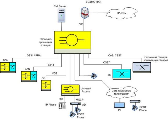 MSAN в качестве станции местной сети коммутации каналов (рисунок 4.7) поддерживает все функции классических телефонных станций, а также обработку протоколов сигнализации сетей TDM (CCS7, CAS, DSS1, Q.SIG, V5.2) сетей NGN (SIP и SIP-T, MGCP и др.).
