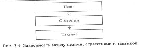 Тактика включает повседневные виды деятельности, связанные с функцией продаж и осуществляемые для достижения маркетинговых целей и целей по продажам. Тактика также включает действия, которые требуется предпринять при появлении неожиданных событий краткосрочного характера на рынке, например целенаправленные усилия по продвижению своей продукции конкурентом. Зависимость между целями, стратегиями и тактикой показана на рис. 3,4.
