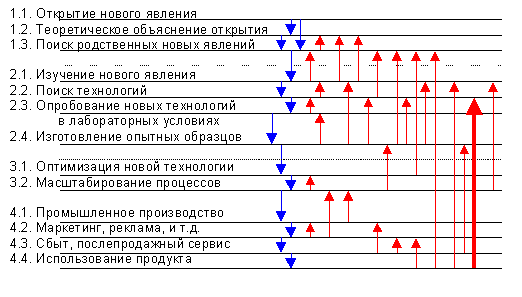 Видно, что "прямому" процессу трансфера, обозначенному левой цепочкой линий со стрелками вниз, сопутствует и обратный процесс передачи информации от последующих стадий к предыдущим, причем обратных потоков информации гораздо больше, чем видится вначале. Особую роль играет цепь обратной связи, обозначенная более толстой линией: именно она чаще и эффективнее других стимулирует зарождение очередной инновации. Таким образом, экономика, рынок стимулируется инновациями и сам стимулирует инновации.