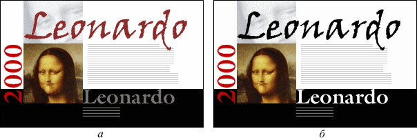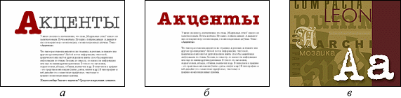 Первая картинка (рис. 13а) представляет собой пример двойного акцента с помощью размера и цвета. В данном случае это ошибочно — заголовок разваливается на составные части, которые трудно воспринимать как одно целое. На второй картинке (рис. 13б) более грамотное применение тех же приемов. Третья картинка (рис. 13в) использует тональный акцент, когда выделяемый объект по тону значительно светлее (как в данном случае), чем все остальные элементы и фон, за счет чего он и выделяется.
