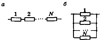 | Рис.1.1. Схемы (модели) соединения элементов в устройстве с точки зрения надежности: а — последовательное соединение; б — параллельное соединение; ЛГ — количество элементов в устройстве |
