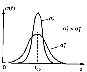 3. Нормальный закон. График плотности распределения времени до отказа в этом случае имеет вид, показанный на рис. Параметрами распределения в этом случае являются tcp — среднее время безотказной работы (среднее время до отказа) и уt — среднее квадратическое отклонение времени безотказной работы. Следовательно, в этом случае они должны использоваться в качестве справочныхданных о надежности i-го элемента.