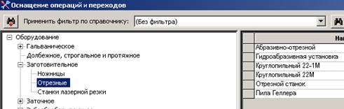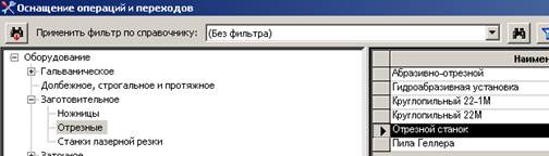 После нажатия клавиши открывается список справочников, в котором нужно найти и открыть таблицу с нужным видом оснащения. Например, для заготовительной операции это будет отрезной станок, который находится в таблице Заготовительное/Отрезные. Справочник раскрывается кликом по значку + или двойным кликом по названию справочника. Раскрывать справочник нужно до тех пор, пока не станут доступны таблицы. В отличие от справочника, таблица не имеет значка + (рис.18).