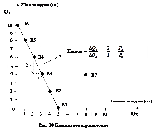 Если бы потребитель пожелал 5 рублей израсходовать на бананы, то при цене в 1 рубль он смог бы купить 5 штук. Это представлено в таблице 7 набором В1 (5 бананов, 0 яблок). В случае приобретения набора В6 (0 бананов, 10 яблок) все 5 рублей, очевидно, расходуются на максимальное количество бананов. Наборы В2, В3, В4, В5 показывают альтернативные комбинации яблок и бананов, которые могут быть куплены при доходе в 5 рублей. Эти комбинации изображены на рис. 10.