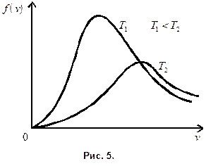 При повышении температуры максимум кривой распределения смещается в область б о льших скоростей, при этом «высота» максимума понижается; это видно из формул (8.7) и (8.8). Площадь же под кривой по-прежнему равна единице. Как видно из рис. 5, относительное число «медленных» молекул при повышении температуры уменьшается, а число «быстрых» возрастает.