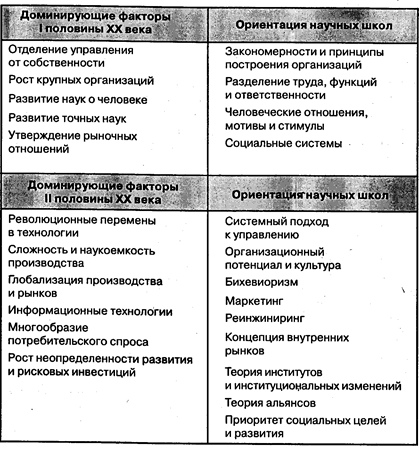 Существующие теории различаются также по способу их разработки. Например, некоторые из них являются результатом логической дедукции, тогда как другие сформулированы на основе исследовательских разработок. Одни теории ведут главным образом поиск базовых характеристик для описания организаций, другие же пытаются описывать «лучшую» организацию. В экономической литературе различают также теории, в которых сделан акцент на задачах подразделений фирмы, рассматриваемых в качестве важнейшей основы анализа, и теории, которые пытаются анализировать организацию в целом. Эти различия в подходах и предмете анализа затрудняют разработку общей теории формирования организаций. Основные факторы, оказавшие влияние на становление и развитие научных школ управления XX века, сгруппированы в табл. 2.1.