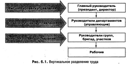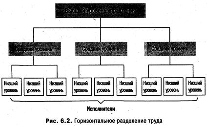 Исследование схем формальных организаций показывает, что существует уровень вертикального и горизонтального разделения труда. Схема вертикального разделения труда представлена на рис. 6.1. Руководитель верхнего уровня управляет деятельностью руководителей среднего и низшего уровней, т. е. формально обладает большей властью и более высоким статусом. Вертикальная дифференциация связана с иерархией управления в организации. Чем больше ступеней иерархической лестницы между высшим уровнем управления и исполнителями, тем более сложной является данная организация. Полномочия распределяются по должностям и руководителям, занимающим эти должности. Цель организации рассматривается как ориентир для направлений потоков связей и полномочий.