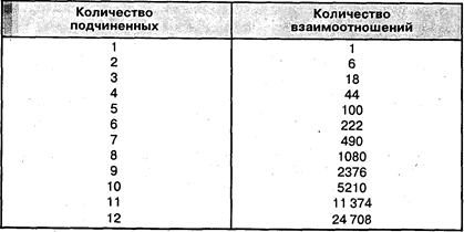 Таблица 6.1 показывает, что быстрый рост количества потенциальных взаимосвязей вызывается ростом числа подчиненных. Решая вопрос об увеличении охвата контролем, руководитель должен рассмотреть все потенциальные взаимосвязи, которые он может иметь с подчиненными, включая их частоту и интенсивность.