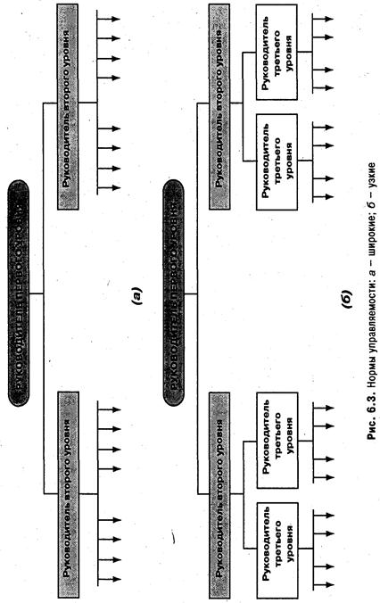 Локхидская модель сосредоточивает внимание на важных организационных переменных, которые в значительной мере влияют на охват контролем. Такой подход заставляет руководителей принимать во внимание такие факторы, как координация, контроль и однородность функций при оценке докладов подчиненных. Следует отметить, что каждая организация должна самостоятельно разрабатывать модель охвата контролем. Широкий охват контролем может быть очень эффективен в ряде случаев, таких, как использование высокообразованной рабочей силы, а узкий охват контролем – когда подчиненные не получили соответствующей подготовки для выполнения работы. В каждом случае требуется исследование таких факторов, как возможность обеспечения контактов между руководителем и его подчиненными, способность работников выполнять работу без непосредственного руководства, уровень подготовленности и реальные возможности обучения работников. На рис. 6.3 схематически представлены варианты широких и узких норм управляемости.