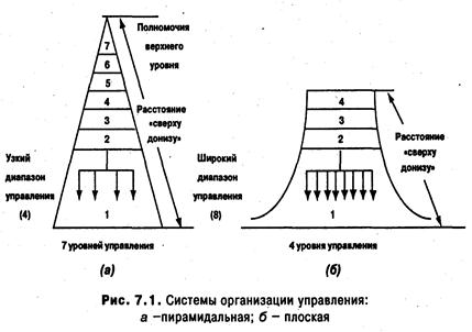 На рис. 7.1 показаны отличия пирамидальных и плоских систем организации управления. Если при парамидальной системе процесс управления растянут по многим вертикальным уровням структуры и число этих уровней, в сущности говоря, не лимитировано (рис. 7.1 а), то при плоской структуре диапазон управления расширяется за счет безусловного сокращения вертикальных звеньев (рис. 7.1 б). Плоская организационная структура с максимальной децентрализацией развивает ориентацию работников на использование внутренних возможностей подразделений, инициативу и способность персонала самостоятельно принимать решения.
