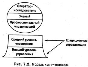 Нередко в качестве одного из вариантов возможной организационной структуры изображается футбольный мяч, балансирующий на верхушке колокола (рис. 7.2). Считается, что такая форма возникнет в результате исчезновения среднего уровня управления и последующего выравнивания организационной структуры, продвижения к вершине организации специалистов в области компьютерной технологии и формальных методов.