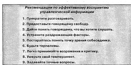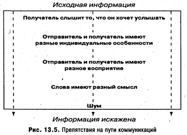 Возможные препятствия на пути коммуникаций представлены на рис. 13.5. Известны многочисленные руководства и правила, направленные на обеспечение эффективного восприятия управленческой информации в процессе коммуникаций. Основной упор в них делается на то, чтобы снять все помехи и барьеры, относящиеся к поведению лиц, получающих деловую информацию. Ниже приводятся некоторые рекомендации, используемые в практике деятельности организаций разных типов и обращенные к руководителю, к которому поступает информация от подчиненных.