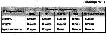 Очевидным становится то, что структура сети коммуникаций влияет на точность и недвусмысленность посланий, на функционирование группы, на чувство удовлетворенности ее членов. Она является важным компонентом в типах взаимодействия внутри организаций, в способности группы направлять общие усилия на выполнение определенных задач. С этих позиций структура в виде колеса считается наиболее простой для организации. В отдельных группах она оказывается эффективной, а в других – нет. В табл. 13.1 показана эффективность различных типов сетей.