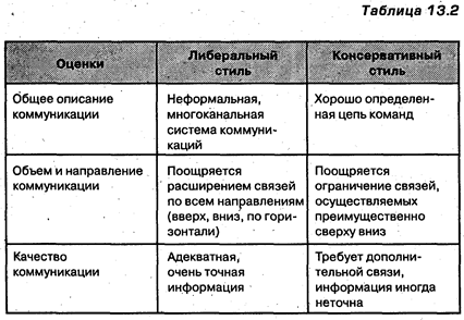 Стиль управления. Коммуникации между руководителями и подчиненными являются двухканальной информационной системой, которая обеспечивает свободный поток информации как в направлении сверху вниз, так и снизу вверх. Вместе с тем руководитель в силу своего положения прямо влияет на направление и поток коммуникаций. Из-за высокой степени вероятности появления шумов при передаче послания руководитель может установить правила, в соответствии с которыми послания должны передаваться в определенном направлении и последовательности. Как показывает опыт, наиболее успешно функционируют те организации, где руководители стремятся, чтобы никто из сотрудников единолично не контролировал коммуникации, чтобы поощрялось участие всех сотрудников в потоке коммуникаций. Нельзя недооценивать также важность взаимопонимания между руководителем и подчиненными. Различия в стиле управления и используемых каналах связи отражены в табл. 13.2.