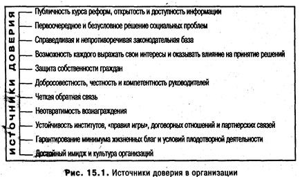 Экономическое содержание категории доверия носит наиболее конкретный и прикладной характер. Доверие в экономике можно рассматривать на различных уровнях. В наиболее агрегированном виде доверие может быть рассмотрено на микро- и макроуровне, т. е. на уровне отдельной организации и на уровне экономики в целом. Источники формирования и укрепления отношений доверия в организации представлены на рис. 15.1.