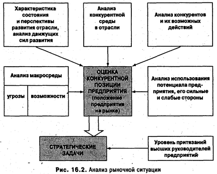 Масштаб поиска необходимой информации зависит от того, является ли проблема повторяющейся, рутинной или новой. Если проблема старая, руководитель может использовать прежние программы и модели решения. Если проблема новая, следует активизировать поиск и вырабатывать достаточное число альтернатив с тем, чтобы обеспечить наибольшую обоснованность намечаемого пути. Существенную помощь в накоплении и учете необходимой информации должен оказать анализ внешней среды предприятия в текущем и перспективном периодах (рис.16.2).