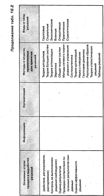 Другое дело - учет возможных рисков, связанных с принятием того или иного решения. В управленческой литературе наиболее распространенной является классификация, предусматривающая такие риски, как капитальный, селективный, временной, риск законодательных изменений, риск ликвидности, кредитный, инфляционный, процентный. Естественно, что в условиях риска можно предвидеть результаты различных альтернатив. Неизвестна лишь вероятность достижения каждого результата. Задача в том и состоит, чтобы выявлять вероятность каждого результата и на этой основе принимать решения, имея в виду конечный желаемый результат. В ситуации большой сложности и риска принятию решения могут помочь методы, связанные с использованием математического аппарата. Попытки оптимизации решений привели к разработке нового специфического математического аппарата и возникновению таких областей математики, как линейное и динамическое программирование, теория игр, теория управления запасами, теория больших систем, общая теория систем и др. (табл. 16.2).