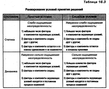 Существует много других способов ранжирования окружающих условий. Например, используются характеристики «простой–сложный», «статика–динамика» и др. К простым относятся те условия, при которых имеется несколько рассматриваемых факторов и небольшое число возможных решений. В сложных условиях приходится иметь дело со многими факторами и большим числом альтернатив. В статических условиях рассматриваемые факторы остаются в основном одинаковыми в течение длительного времени, изменяются предсказуемо и постепенно. В динамических условиях степень изменения факторов весьма значительна. Как показали исследования, факторы «статика–динамика» оказывают большее влияние налицо, принимающее решение, чем факторы «простой-сложный». В табл. 16.3 приведены характеристики степени неопределенности в «простых» и «сложных» условиях, оказывающие влияние на методы и процесс принятия управленческих решений.