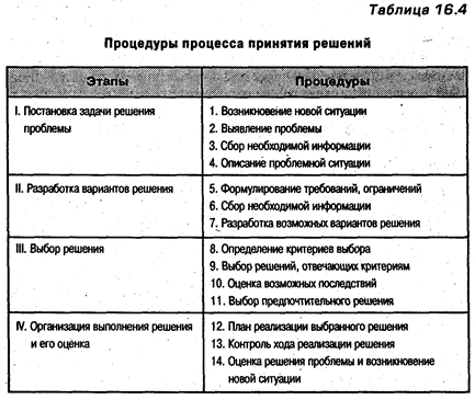 Кто должен принимать решение: индивидуум или группа? Существует несколько возможных схем: 1) руководитель может принимать решение один; 2) решение может быть принято руководителем после консультации с другими; 3)те, на кого влияет решение, могут принимать его как группа (руководитель при этом выступает как один из членов группы). Во всех случаях важно соблюдать установленные процедуры, выполнение которых обеспечивает необходимую обоснованность и надежность того или иного решения (табл. 16.4).
