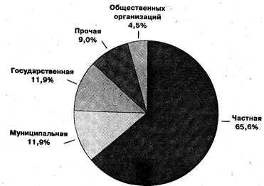 Наиболее значимый результат приватизации, проведенной в России в 1990-х годах, состоит в массовом появлении (наряду с государственными предприятиями) предприятий, находящихся в частной собственности. Речь идет о закреплении прав собственности на приватизируемое государственное имущество за ответственными (эффективными) собственниками, приобретшими это имущество на законном основании. Распределение предприятий по типам собственности представлено на диаграмме (рис. 18.1).