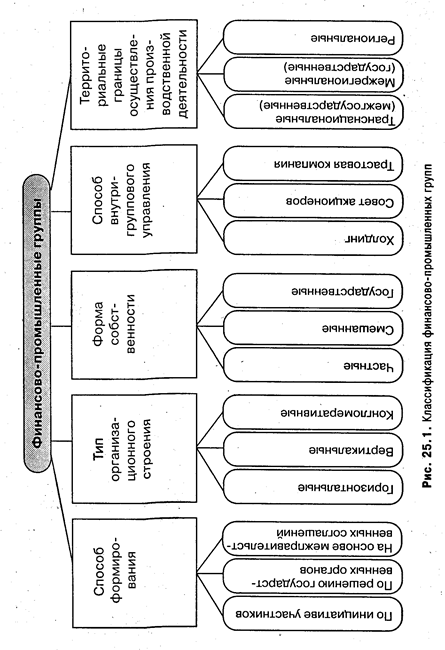 Разновидности финансово-промышленных групп и критерии их образования представлены на рис. 25.1. Характер деятельности ФПГ, степень их универсализации предопределяются экономической целесообразностью, с одной стороны, и степенью развитости рыночных отношений в стране, с другой. Как показывает опыт, в настоящее время сохраняется устойчивая тенденция к универсализации ведущих ФПГ.