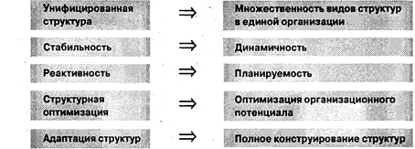 И, наконец, структура, зафиксированная в схемах и уставах, занимает все меньше места в проектах организации. Потоки информации, процессы принятия решений, проектные графики или временные предписания становятся все более существенными источниками информации о ролях и распределении прав и ответственности. Организационную структуру можно выбрать только при комплексном подходе к изменениям предприятия и его внешней среды.