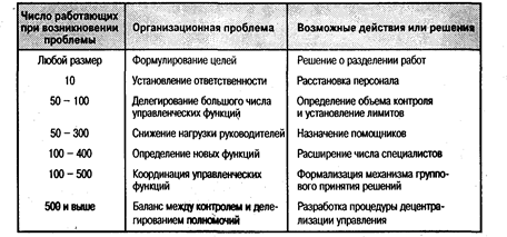 Даже в условиях устойчивого ассортимента продукции, стабильных производственных процессов и сбыта при увеличении размера предприятия появляется необходимость в структурном преобразовании. К росту масштаба деятельности можно приспособиться и посредством несущественных изменений в структуре. Тем не менее, если основная структура остается без изменений, от этого затруднится координация, руководители будут перегружены, ухудшится функционирование предприятия. Например, под влиянием роста числа работающих на предприятии возможны такие организационные изменения (табл. 28.1). Указанные в таблице данные получены на основе обобщения достаточно широкого круга экспериментальных данных.