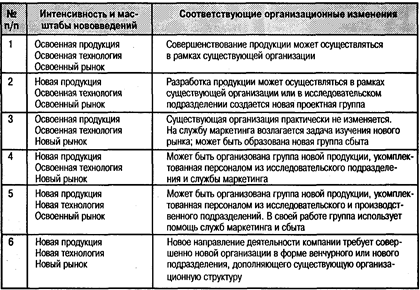 О влиянии комбинаций нововведений (изменений в продукции, технологии и положении на рынке) на организационную структуру свидетельствуют данные табл. 28.2.