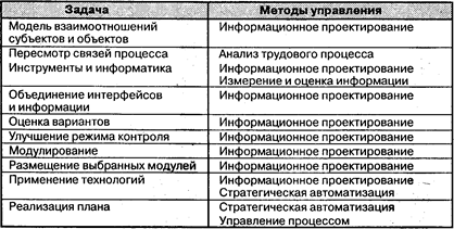 Нередко при выполнении задач данного этапа находится та часть процесса реорганизации, которая может осуществляться автономно. Этот фрагмент дает возможность перегруппировать процесс в пространстве (например, децентрализовав его) или во времени (например, перемещая фрагменты из одной временной фазы в другую). В процессе реорганизации используются различные технологии для моделирования, анализа статистических данных, сбора информации и документирования процессов, компьютерных разработок, проведения телеметрии, создания экспертных систем, баз данных и др. Намечаются конкретные меры по техническому оснащению (табл. 29.5).