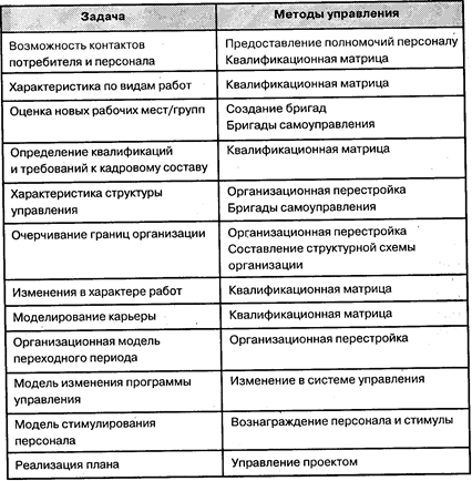 С целью наиболее эффективной реализации программы разрабатываются предварительные планы по осуществлению социальных мер, включая комплектование персонала, его обучение и кадровые перестановки. Эти планы подразделяются на временные периоды параллельно с планами по техническому оснащению. Кроме того, определяется структура высшего уровня управления, т. е. роль и ответственность собственника, руководителя организации и руководителя проекта реорганизации. В табл. 29.6 показаны методы управления, применяемые в ходе выполнения задач данного этапа.