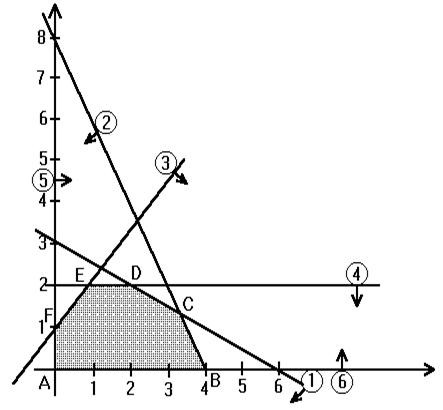 2) Пересекаясь полуплоскости, образуют многоугольник решений (смотрите рисунок 1). Каждая точка многоугольника решений определяет некоторый план производства, который удовлетворяет всем экономическим и техническим ограничениям. Мы должны из этого множества планов выбрать оптимальный, т.е. план, дающий наибольшую прибыль.