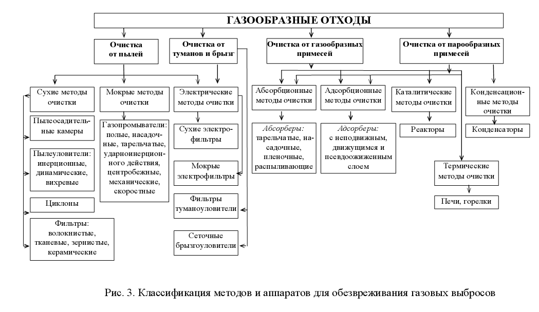 Классификация методов и аппаратов для обезвреживания газовых выбросов от различных примесей приведена на рис. 1. Эта классификация является приближенной. Она не охватывает всех существующих методов и тем более аппаратов для газоочистки.