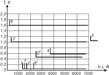 ) с выдержкой времени 1,6 с (кривая 6); для защиты Т1 и Т2 от междуфазных КЗ использовали дифференциальную защиту