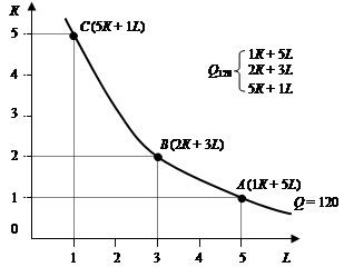 Максимальный выпуск продукции при различных сочетаниях факторов производства (трудовых и капитальных затрат) приведен на рисунке 12. Объем (Q), равный 120 ед., получаем при различных сочетаниях труда и капитала: 1 К + 5 L; 2 К + 3 L; 5 К + 1 L. На базе данных комбинаций построена изокванта с Q = 120.
