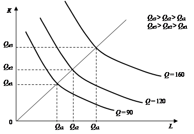 Изокванта – линия равных объемов выпуска при различных сочетаниях факторов производства или графическое выражение функции типа Q max= f (К, L), каждая точка которой показывает одинаковый объем и множество соотношений К и L.
