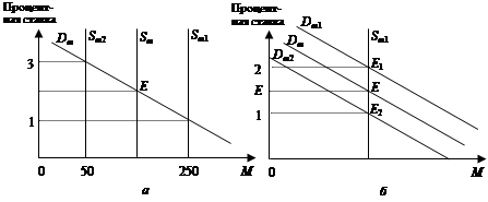 Таким образом, спрос на деньги зависит от объема ВВП, процентной ставки, скорости обращения денег. Равновесие на денежном рынке устанавливается тогда, когда обеспечивается оптимальное состояние между процентной ставкой и равновесным объемом денег. Однако нарушение данного равновесия может произойти как вследствие изменения предложения денег (рисунок 18 а), так и спроса на них (рисунок 18 б). Процентная ставка, реагируя на эти изменения, восстанавливает равновесие на денежном рынке.