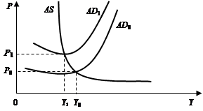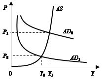 1. Инфляция спроса. Она возникает тогда, когда происходит автономное увеличение совокупного спроса. В экономике слишком много денег по сравнению с товарной массой. Инфляция спроса сопровождается ростом ВВП (Y), либо ВВП не изменяется (рисунок 23).