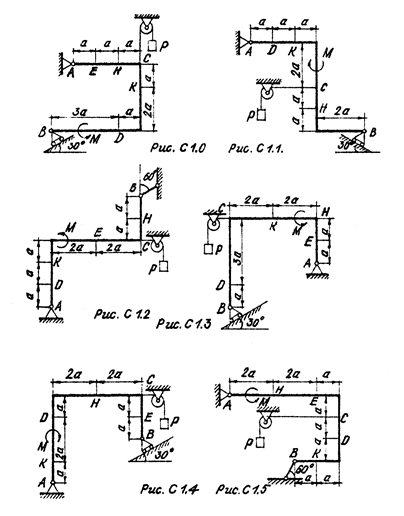 В точке С к раме привязан трос, перекинутый через блок и несущий на конце груз весом Р = 25 кН. На раму действуют пара сил с моментом М = 60 кН·м и две силы, величины которых, направления и точки приложения указаны в таблице 1 (например, при номере условия 9 на раму действуют две силы: F2 = 20кН, приложенная в точке Е и расположенная под углом 75° к горизонтальной оси, и F3 = 30кН, приложенная в точке К и расположенная под углом 30° к горизонтальной оси.).