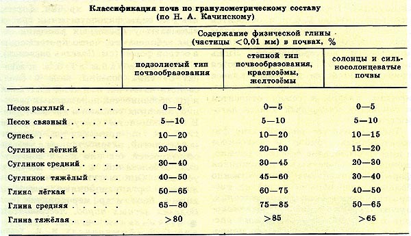 По преобладанию частиц той или иной фракции почвы относят к щебнистым, песчаным, суглинистым, глинистым разновидностям. Существуют различные классификации почв по гранулометрическому составу, наибольшее распространение в отечественном почвоведении имеет классификация Н.А. Качинского (табл. 2). По этой классификации все почвы подразделяются на категории в зависимости от содержания в них физической глины. Кроме того, в этой классификации учтены особенности гранулометрического состава почв с различным типом почвообразования.