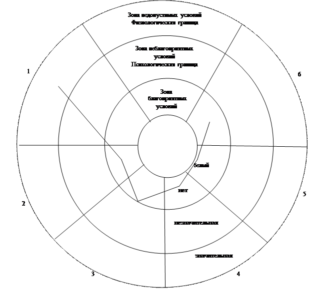 1 – шум, дБА; 2 – температура воздуха, °С; 3 – освещенность, лк; 4 – загроможденность рабочих площадок; 5 – цвет стен, потолков; 6 – относительная влажность воздуха, %.