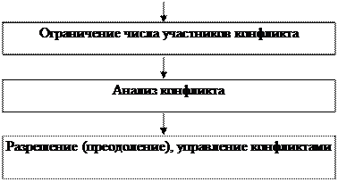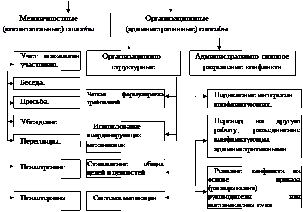 Конфликт - форма столкновения противоборствующих сторон, имеющая свой сюжет, композицию, энергию, которые по ходу действия трансформируются в кульминацию и развязку и заканчиваются положительным или отрицательным решением проблемы. Различают межличностные конфликты, личностный конфликт между внешней средой и внутренней моралью, конфликты по поводу распределения ролей на работе, деловые конфликты из-за столкновения интересов различных подразделений, семейные конфликты по различным проблемам и др. Основными методами управления конфликтами являются воспитательные и организационные (рис. 1).